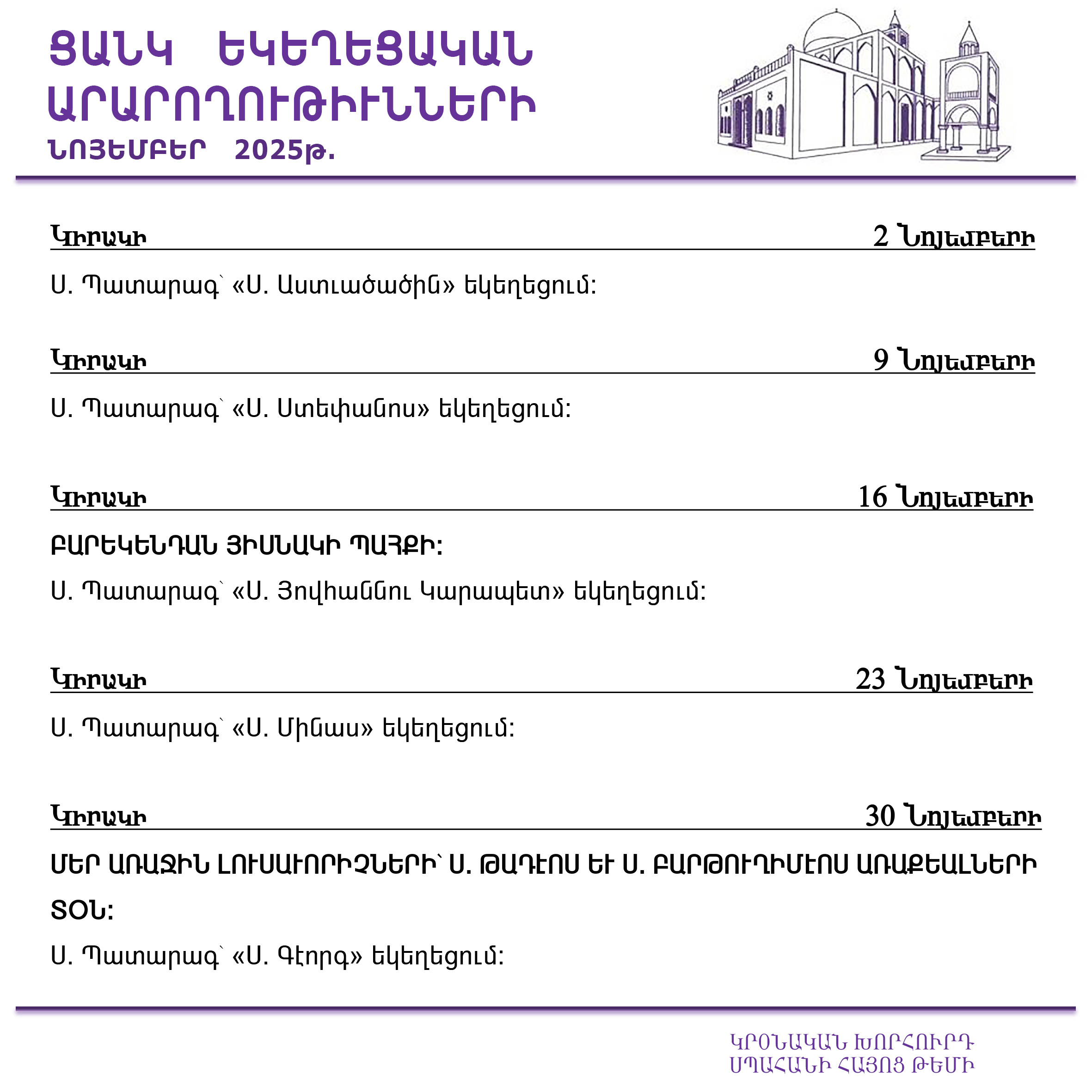 ՑԱՆԿ ԵԿԵՂԵՑԱԿԱՆ ԱՐԱՐՈՂՈՒԹԻՒՆՆԵՐԻ - ՆՈՅԵՄԲԵՐ 2025