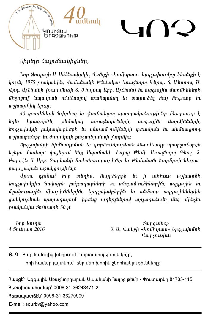 40-ԱՄԵԱԿ Ս. ԱՄԵՆԱՓՐԿՉԵԱՆ ՎԱՆՔԻ «ԿՈՄԻՏԱՍ» ԵՐԳՉԱԽՄԲԻ