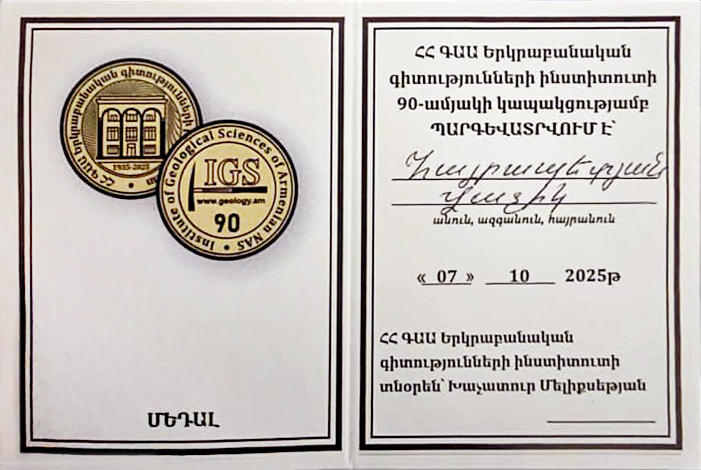 Մեդալը տրւել է ինստիտուտի տնօրէն Խաչատուր Մելիքսեթեանի կողմից: