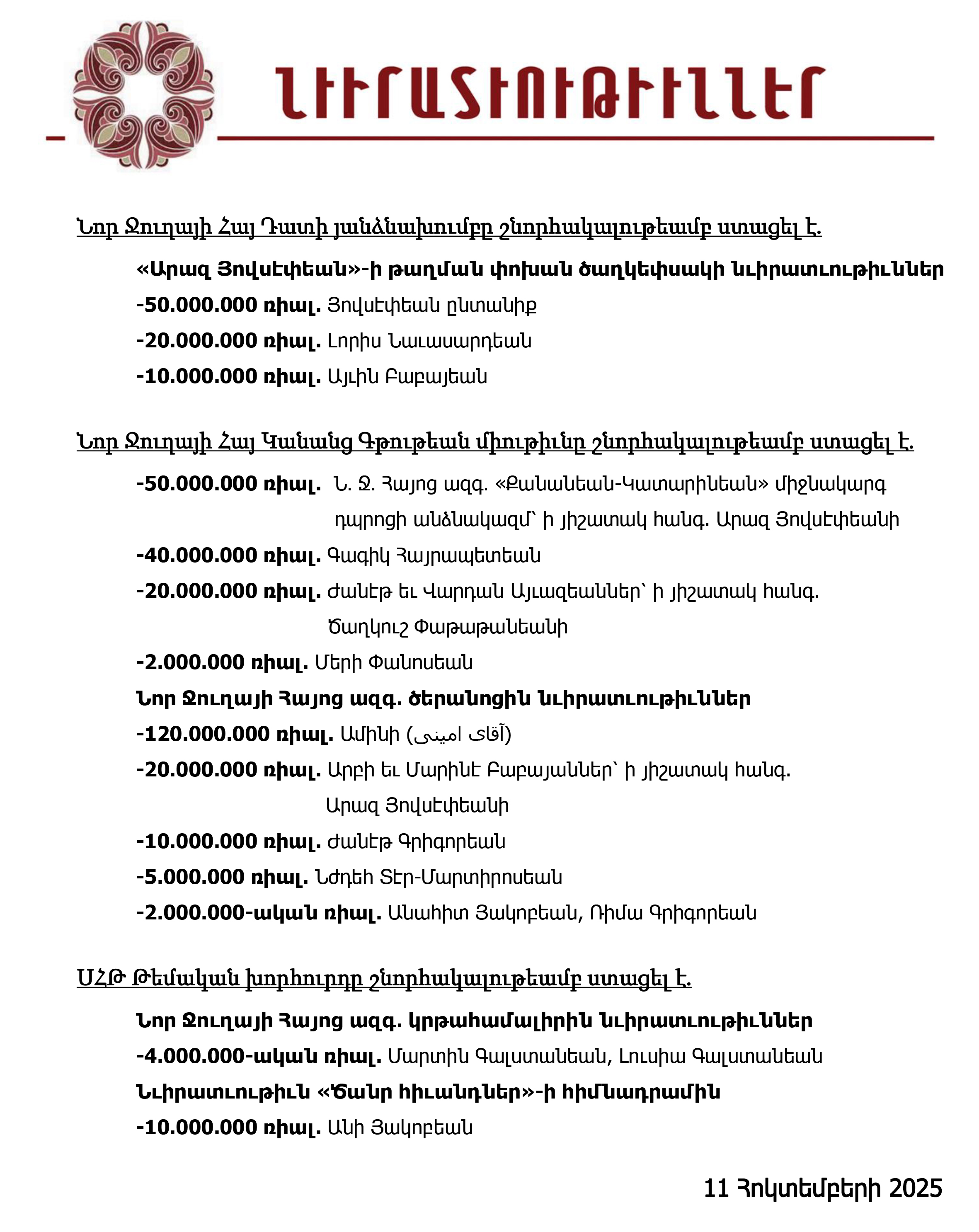 Նւիրատւութիւններ (11 Հոկտեմբեր 2025)